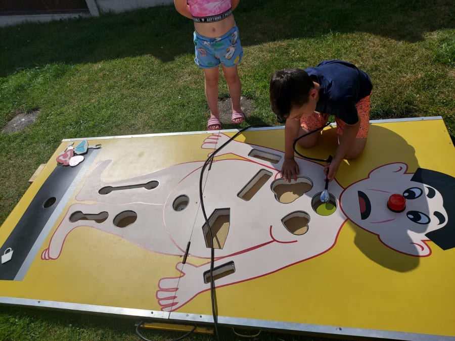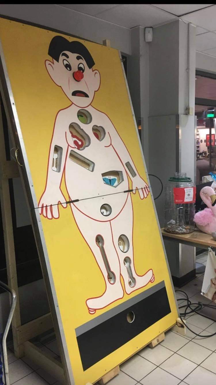 The patient is a large authentic fibreglass male patient that has ten individual cavities, positioned all over his body. Each cavity contains a body part for example, "Adams Apple", Tennis Elbow" and "Butterflies in the Tummy" and many other silly injuries that require your expert attention. Are you up to the Giant operation hire challenge?